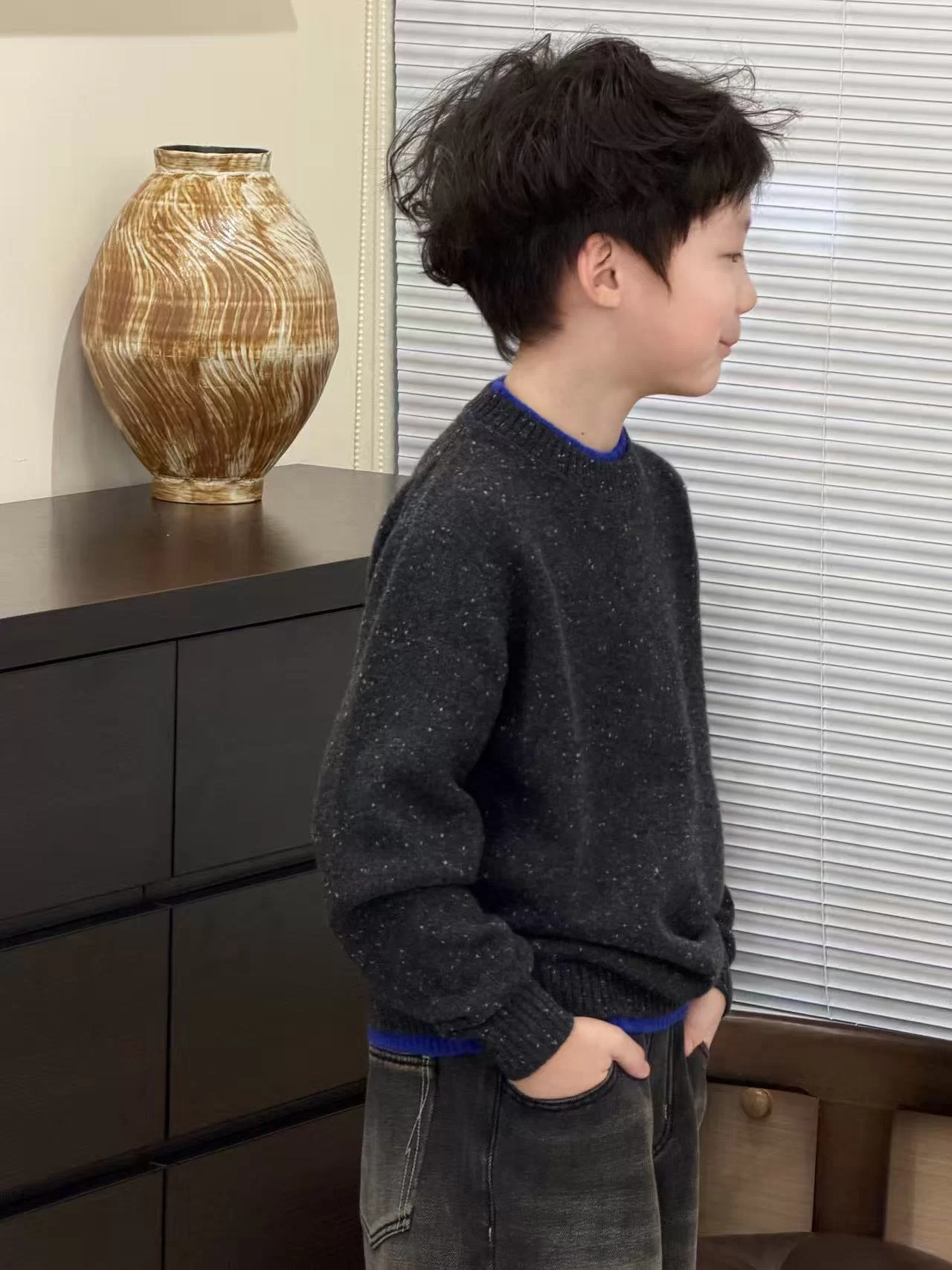 • Round neck sweater presented in minimalist solid colors with a fine knit texture